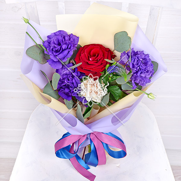 Роза красная – 1 шт., эустома фиолетовая-1 шт., гвоздика кремовая – 1 шт., декоративная зелень (вероника, эвкалипт), упаковка, лента.