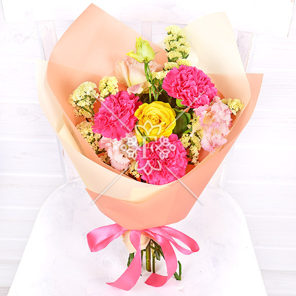 Гвоздика малиновая -3 шт., роза жестая – 1 шт.,эустома розовая -1 шт.,статица желтая – 1 шт., упаковка, лента.